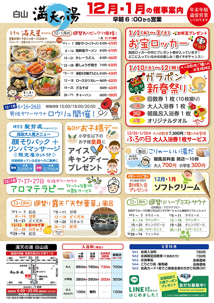 12月、1月のイベントのお知らせ 1124 イベント 満天の湯「白山インター店」では下記の期間イベント湯を開催します。 様々なお得なキャンペーン、イベントを開催いたしますので、奮ってご来場下さい。 前の記事へ 一覧へ戻る