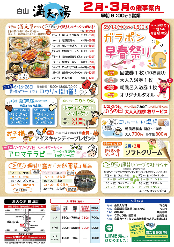 2月、3月のイベントのお知らせ 126 イベント 満天の湯「白山インター店」では下記の期間イベント湯を開催します。 様々なお得なキャンペーン、イベントを開催いたしますので、奮ってご来場下さい。 前の記事へ 一覧へ戻る