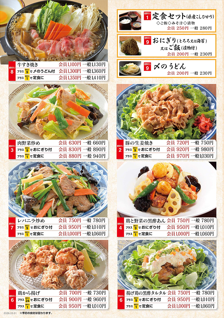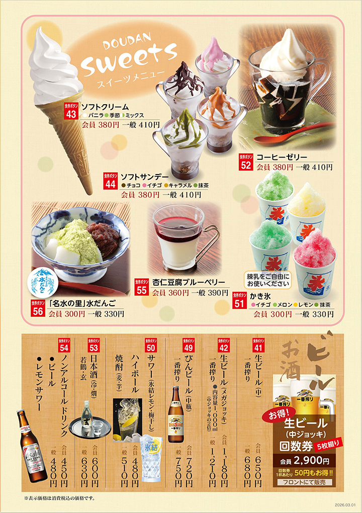 定食から一品料理まで、ご家族で楽しめるメニューを豊富に取り揃えております。お風呂上がりのひとときをゆったりとお過ごしくださいませ。